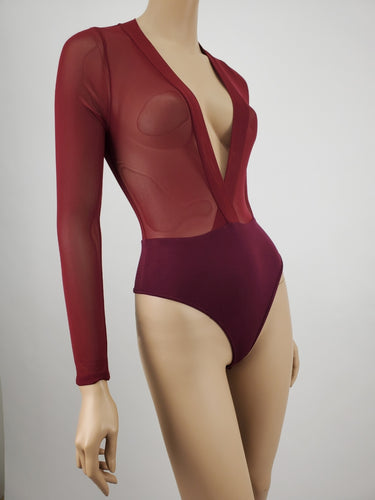 Deep V-Neck Mesh Bodysuit with Contrast (Wine)